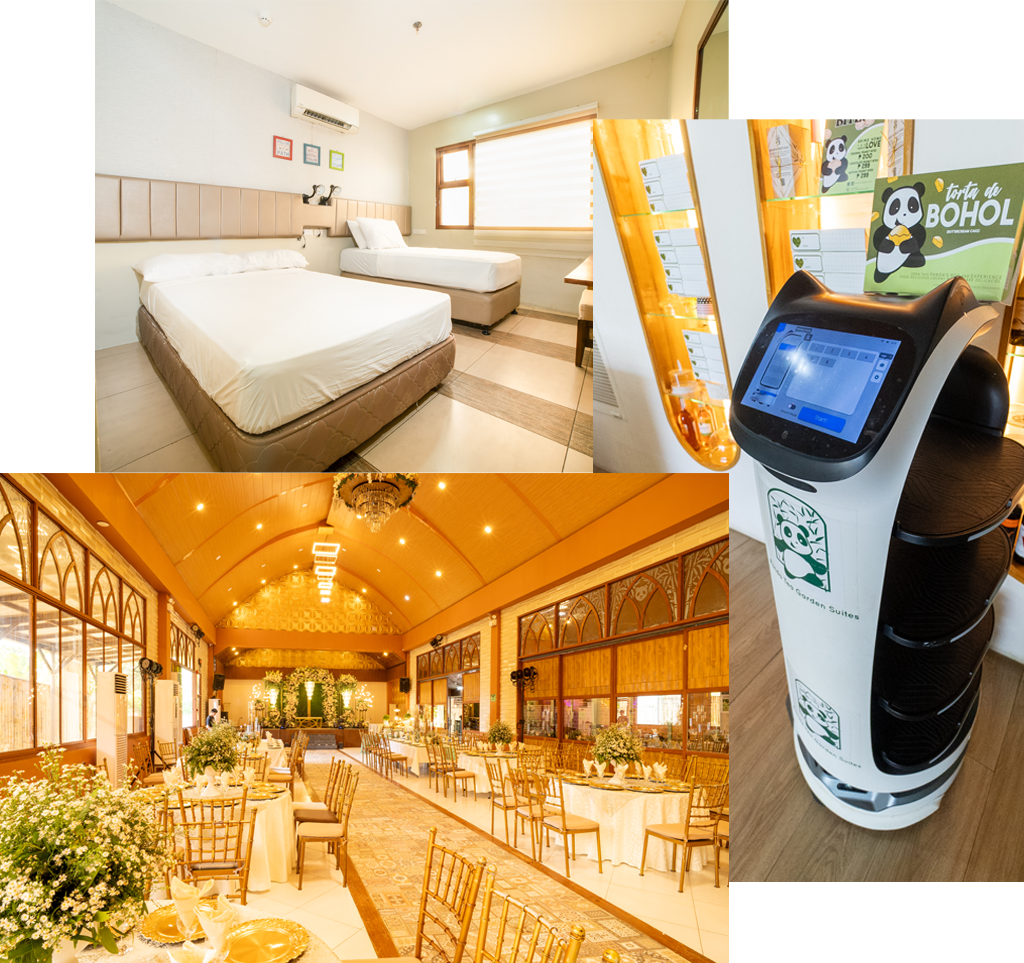 PANDA TEA GARDEN SUITES is Bohol's premier economy hotel, offering suites with a modern aesthetic. Guests can enjoy a gourmet menu crafted by an international chef, featuring a wide array of Asian and European breads, cakes, and pastries, alongside a selection of tea, coffee, and chocolate beverages.
